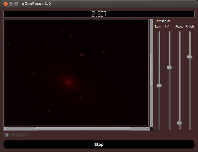 Ne trouvant rien d'abordable pour résoudre ce problème, j'ai décidé de coder un petit outil en Qt4.8 qui doit : lancer la capture de l'appareil photo par usb, tranférer le fichier par le même moyen, traiter un minimum l'image, voire permettre une mesure quantitative du focus, ce qui permet de savoir si on s'éloigne ou pas de la zone de netteté, le tout en boucle, pour ne pas à avoir à cliquer sans cesse.